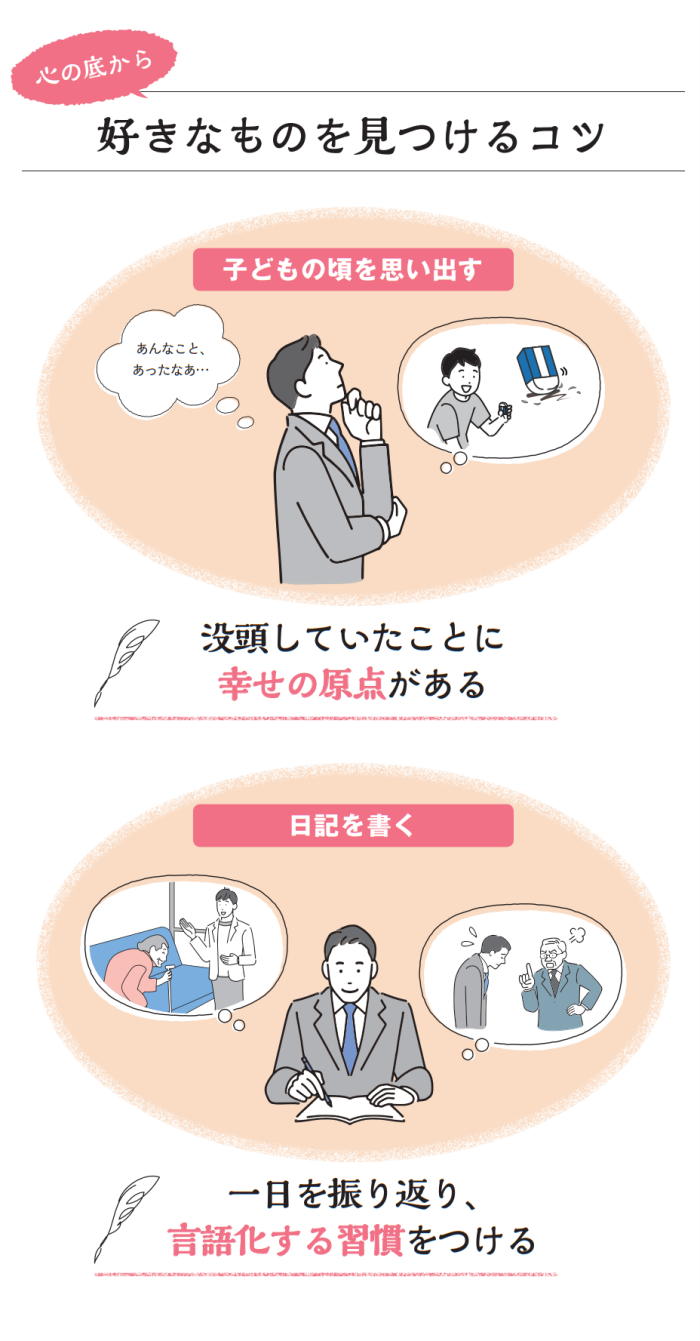 「一番良いのは、子どもの頃どんなことに夢中になったかを思い出してみる。野球、将棋、虫取り、消しゴムのかす集め……。たぶんそこには、親や先生にやれと言われたことは入っていないでしょう。それでいいのです。消しゴムのかす集めなんて大人からみたら何の価値もありませんが、それでも子どものあなたがなぜかそれに没頭していたなら、そこにこそあなたの幸せの原点があるのです。