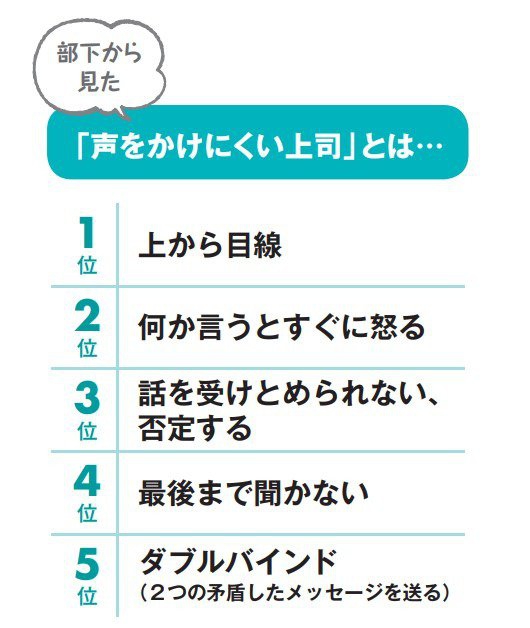 武藤 私が実施したアンケート調査の結果によると、第1位は上から目線の上司。2位はすぐに怒る上司。3位は話を受けとめられない上司。4位は話を最後まで聞かない上司。5位はダブルバインドの上司。ダブルバインドというのは2つの矛盾したメッセージを送るという意味で、例えば、口では「君を責めるつもりはないけど」と言いつつ、明らかに怒った表情や口調で責めるような上司を指します。