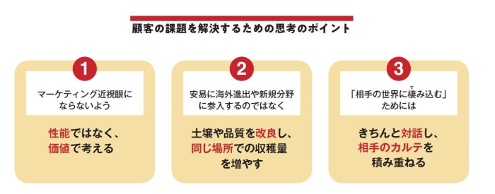 「昔よりもマーケティングの考え方が浸透してきたとはいえ、日本の経営者の多くは未だに技術や海外進出などを重視する傾向にあります。例えば、関西で製品を売っている企業で売り上げが鈍化してくると、経営者が新たな技術開発を指示したり、東京進出や東南アジアへの進出を考えたりする――という具合に。しかし、本来、経営者にとって重要なのは、土壌や品種を改良しながら、同じ場所での収穫量を増やしていくことでしょう」
