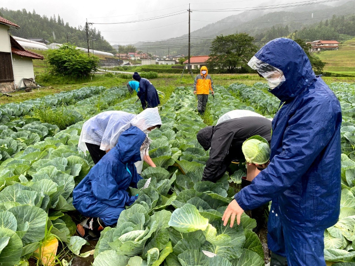 「キャベツ農場研修」の様子。新入社員がお好み焼きに欠かせないキャベツを畑で育てて収穫する