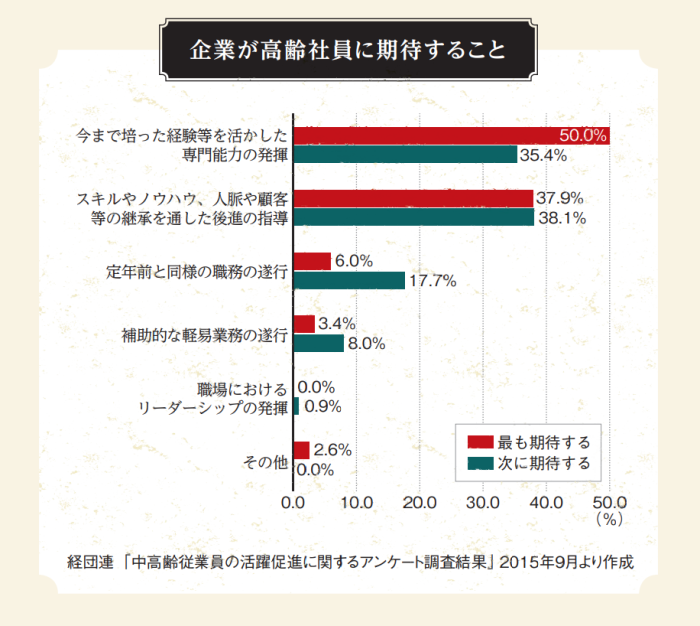 しかし次第に、“会社の大事な戦力”として雇用を続ける「戦略的雇用」へと変化してきました。その傾向は今後さらに強まると思います。60歳になったら急に能力がガタ落ちするわけではありませんから、いきなり補助的な仕事しか任せないのは、合理的ではありません。むしろ、それまで蓄積した経験を活かすことができれば、極めて有能な即戦力になりうるわけです。