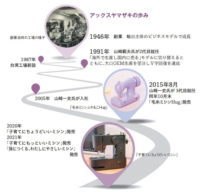 創業は1946(昭和21)年。山﨑一史社長の祖父卯一郎氏が大阪市で家庭用ミシンの製造を始めた。小規模ながら輸出主体で伸びていったが、円高により採算が取れなくなり、つぶれかけた。債務超過に陥っていた91(平成3)年、父の範夫氏が後を継ぎ、海外で製造、国内で販売する仕組みに転換し、業績をⅤ字回復させた。