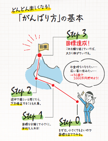 では、どんな目標を立てればよいのでしょう。私は“小さな目標”を持つことを勧めます。いきなり「スティーブ・ジョブズのように世界を変えてみせる」といった壮大な目標を掲げる必要はありません。最初は「1000万円貯める」といった即物的なものでいいのです。