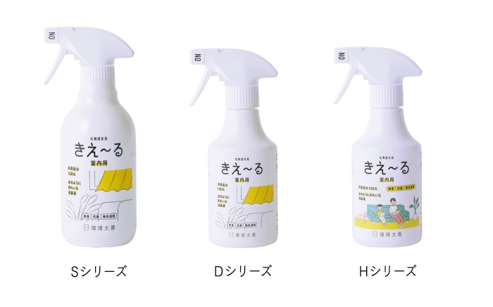 看板商品である「きえ~る」。バイオマス素材のボトルを使用したサステナブルの「Sシリーズ」、快適な毎日(デイリー)をサポートする「Dシリーズ」、ホームセンターや量販店専用の「Hシリーズ」の3シリーズを現在展開している