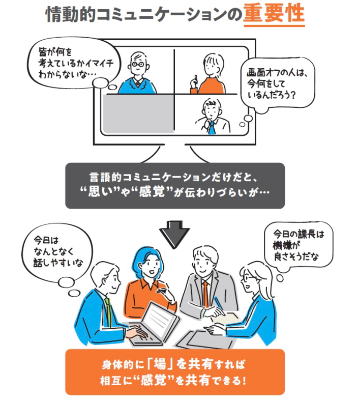 対して、情動的コミュニケーションは、五感を含む身体全体で無意識に環境を認識しながら行います。例えば、会議室に入った瞬間、「今日の会議は上手くいきそうだな」「今日は盛り上がりそう」などと一瞬にしてその「場」を感じることがあると思いますが、これはまさに情動的なコミュニケーションから生まれる感覚です。この2つのコミュニケーションを大事にすることによって、「場」の状況がよくなっていくのです。