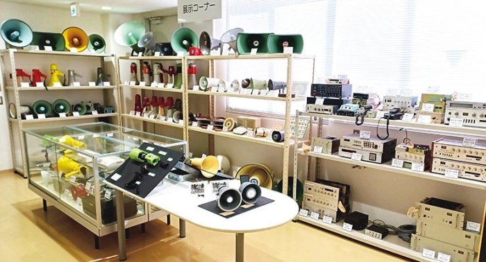 社内にはさまざまな拡声器が並ぶ。車載用スピーカーから小型メガホンまで。ニッチな需要にも応えられるのは確かな技術を持つ職人たちあってこそ