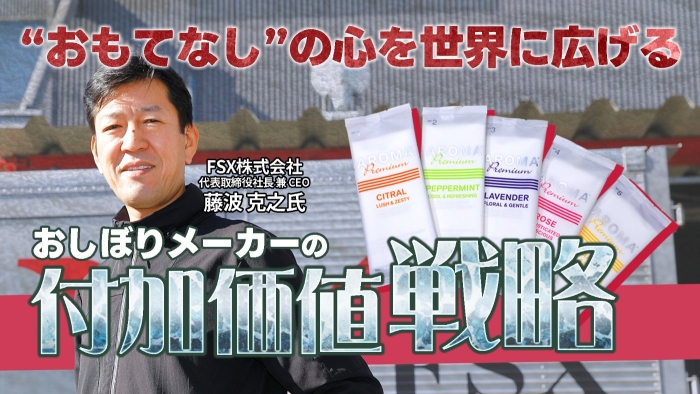 FSXは、おしぼりの会社である。が、社名だけではわからない。1967(昭和42)年、2代目である藤波克之さんの父・璋光さんが「藤波タオルサービス」として創業。2016(平成28)年、50周年を機にFSXに社名変更をしたのである。「ずっと海外展開をしたいと思っていまして、海外でも通じるように“攻め”の気持ちを、この名前に託したんです」